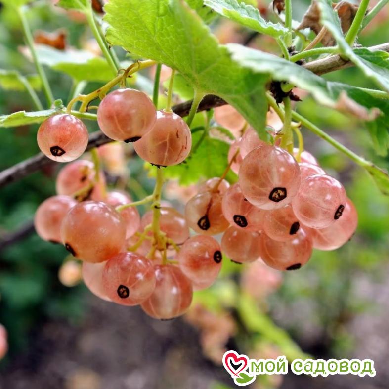 Гибрид белой и красной смородины, выведенный в 80-х годах. Эта заслуга принадлежит селекционерам из Канады. Полученный в результате скрещивания сорт даёт более сладкие и крупные плоды по сравнению с исходным материалом. Они ценятся благодаря универсальному применению. Из смородины готовят множество вкусных десертов. Ботаническое описание Раннеспелый сорт представляет собой густо облиственный, раскидистый кустарник. Высота взрослого растения составляет 0,9 – 1,2 м, а окружность кроны — в пределах 1 м. Молодые ветви вертикальные и прямостоячие, слегка опушенные, с розовым оттенком по всей длине. Ежегодный прирост равен 60 см. Старые побеги одревесневшие, бледно-коричневой окраски. Листва крупная, трёх- или пятилопастная, зелёного цвета, с небольшими зубцами и вырезами (лопасти слабовыраженные). На ветках листья размещены по спирали, на длинных черешках. Поверхность у них матовая, морщинистая, кожистая, покрыта пушком в нижней части. Цветки белые, некрупные, обоеполые. Зацветает Розовый жемчуг в апреле-начале мая. Кисти по структуре рыхлые, размером до 12 см. Ягодки плотные, практически прозрачные, с розоватым оттенком. Размещены они на поникающих гроздьях. Диаметр плодов составляет 8 – 10 мм, а вес равен 0,9 – 1 г. Урожай поспевает в июле, спустя 70 суток после опыления. Плодоножка тоненькая, светло-зелёного цвета. Отрыв сухой. Кожура прозрачная и тонкая. Мякоть ароматная, сочная, сладкая на вкус. Розовый жемчуг – скороплодный сорт, с одновременным созреванием плодов. На 4 год после высадки саженец даёт максимальную урожайность. С одного экземпляра можно собрать свыше 7 кг плодов. Состав Состав биологически активных компонентов у плодов Розового жемчуга довольно разнообразный. В 100 г продукта содержатся: белки; жиры; вода; углеводы; зола; пищевые волокна; моносахариды и дисахариды. Ягоды являются богатым источником витамина А, группы В, С (49% суточной нормы). Также в них много фитонутриентов. Из минералов в продукте содержатся: калий, магний, кальций, железо, фосфор, медь и марганец. Приём ягод в пищу показан людям, страдающим повышенным артериальным давлением. Агротехника Саженцы Розового жемчуга высаживаются поздней осенью, так как корневая система гибрида приживается только в хорошо увлажнённом грунте. Что касается состава, красная смородина предпочитает суглинки и супесчаники. Уровень кислотности не играет особой роли в развитии рассады, но оптимальным значением для ягодника считается 6,6.  При повышенных показателях pH потребуется известкование. Участок для посадки должен хорошо освещаться. Растения помещают в лунки глубиной 80 см (наполненные на 20 см смесью соломы, зёрен ячменя и гумуса). Расстояние между саженцами – 2 м, а интервал в междурядии — от 1,2 м и более. Уход за смородиной Розовый жемчуг включает своевременную обрезку. Плодовые почки у кустарника формируются у основания годовалых ветвей, а также на коротких (размером 2 – 3 см) многолетних плодовых побегах. Следовательно, плодоносит куст даже в зрелом возрасте, а значит, стрижка ему нужна реже, чем другим сортам. Достаточно каждый год оставлять 3 – 4 самые мощные побега, а остальные убирать. По такому принципу действуют на протяжении 5 лет после переноса саженца на участок. По окончании этого времени кустарник должен «обзавестись» 20-ю разновозрастными ветками. Процедуру выполн